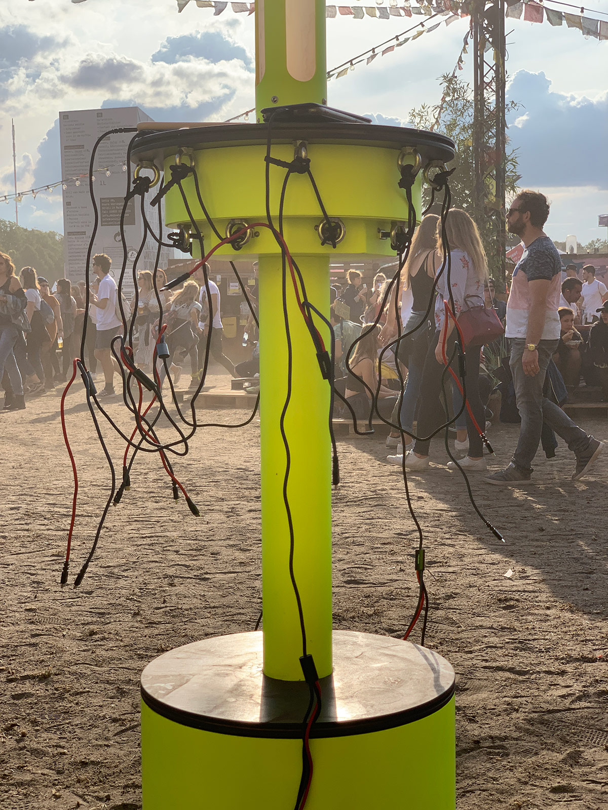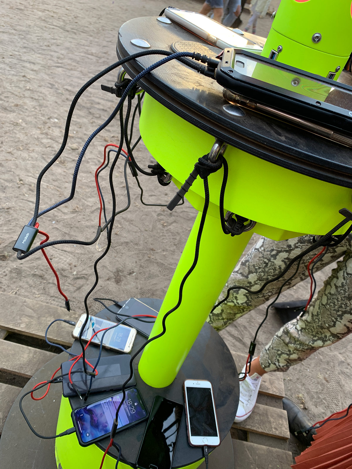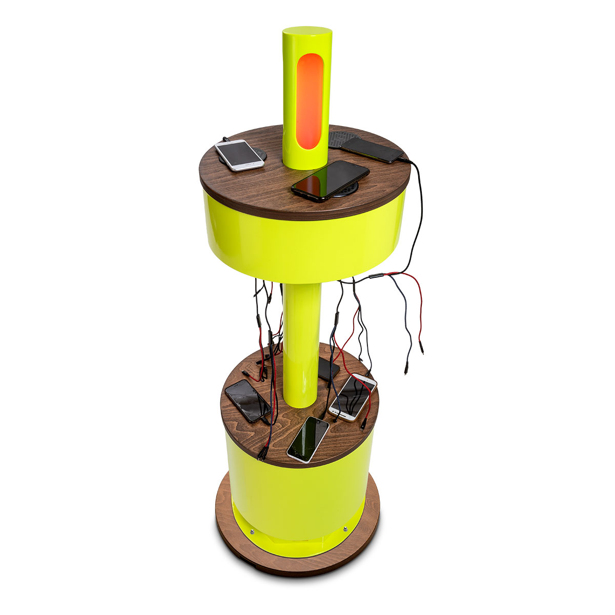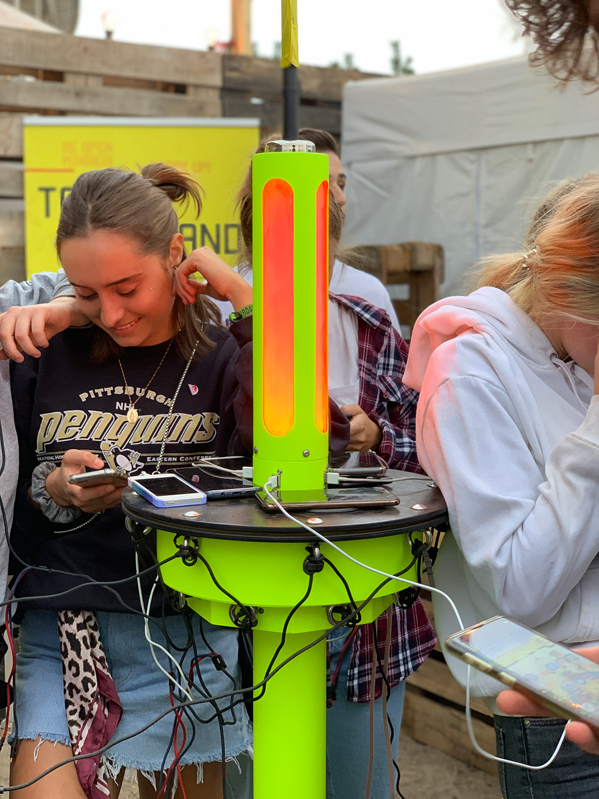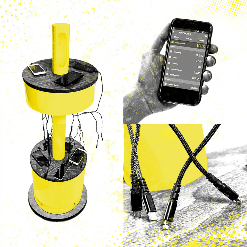 An jeder WIREFIRE-Säule können bis zu 23 Geräte gleichzeitig geladen werden. Dank des starken integrierten Akkus ist WIREFIRE je nach Auslastung bis zu 7 Tage lang energieautark, bevor wieder aufgeladen werden muss. Das geht über das normale Stromnetz, über einen Muskelkraft-Tretgenerator oder auch über Solarmodule. Falls WIREFIRE fest installiert werden soll oder direkt am Aufstellort ein Stromanschluss vorhanden ist, können wir auch eine Version ohne eingebauten Akku zur Verfügung stellen.
